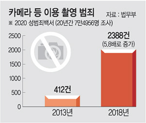 전체 성폭력범죄 발생 건수는 2008년 1만6234건에서 2017년 3만2824건으로 약 2배로 증가했다. 특히 ‘카메라 등을 이용한 촬영 범죄’가 최근 6배 가까이로 급증한 것이 나타났다. 2013년 412건에 불과하던 카메라 등 이용 촬영 범죄는 2018년 2388건으로 집계됐다. 불법촬영 범죄자의 절반 이상(56.5%)은 20·30대였다.