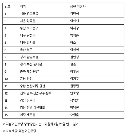 민주당 중앙선거관리위원회는 26일 오후 10시 여의도 당사에서 1차 경선지역 가운데 15곳의 경선 결과를 발표했다.