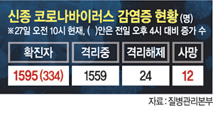 이날 질병관리본부에 따르면 오전 9시 현재 전국 확진자 수는 전날 오후 4시 대비 무려 334명이 급증했다. 전날 오전 9시 대비로 보면 24시간 만에 449명이 폭증한 셈이다. 대구지역의 확진자만 307명으로 상당수는 신천지대구교회 신도인 것으로 추정된다. 특히 확진자 숫자는 25일 오전 9시∼26일 오전 9시 사이에 253명이 증가했던 만큼 ‘S자’ 형태를 보이면서 가파르게 늘어나고 있다. 사망자는 전일 오후와 마찬가지인 12명으로 증가하지는 않았지만 아직 통계에 반영되지 않은 사망자가 대구에 한 명 더 있는 것으로 알려졌다. 이 외에 호흡곤란 등의 증세를 보이고 있는 환자도 계명대 동산병원에 2명, 경북대병원에 2명 등이 있어 사망자는 추가로 늘어날 가능성이 있다.