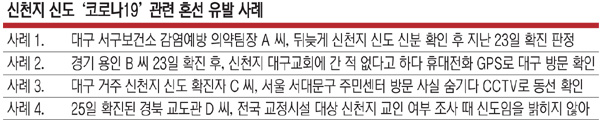 이처럼 신천지 관련 환자가 폭증하고 있지만, 신천지 확진자가 동선 조사에 비협조적이거나 거짓진술을 하는 경우가 있어 문제로 지적된다. 대구에 거주하는 신천지 교인으로 지난 20일 서울 마포구보건소에서 코로나19 확진 판정을 받은 111번 확진자(20)가 서울시 역학조사에서 자신의 동선을 일부 숨기는 등 거짓 진술한 것으로 뒤늦게 밝혀졌다. 앞서 경기 용인시의 코로나19 확진자가 대구 신천지교회 예배에 참석하지 않았다고 부인했지만 휴대전화 GPS를 통해 지난 16일 대구에 있었던 것으로 드러나는 등 신천지 신도들의 진술 신빙성이 논란이 된 적도 있다.