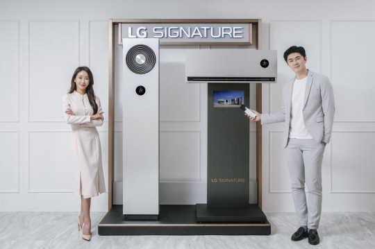 LG 시그니처 에어컨 신제품은 27평형 스탠드 에어컨과 7평형 벽걸이 에어컨으로 구성된 투인원(2in1)이며 가격은 출하가 기준 1090만 원이다. 주문 고객은 3월 중순부터 제품을 받아볼 수 있다.