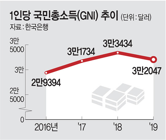 3일 한국은행이 발표한 ‘2019년 4분기 및 연간 국민소득(잠정)’에 따르면 1인당 GNI는 3만2047달러로 1년 전과 견줘 4.1% 감소했다. 한은은 이에 대해 수출 주요 품목 가격 하락 등 교역 조건 악화와 환율이 1인당 GNI 감소에 영향을 끼쳤다고 설명했다. 가장 큰 요인은 환율이다. 명목 GNI를 인구로 나눈 뒤 원·달러 환율을 반영해 산출하는 1인당 GNI 특성상 환율 영향을 많이 받을 수밖에 없기 때문이다. 원·달러 환율은 지난해 연평균 5.9% 상승한 것으로 나타났다.