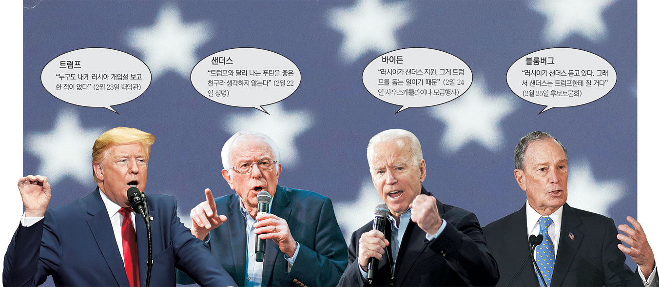 러시아의 대선 개입을 막는 방안 마련에 더해 러시아 변수를 자신들에게 유리하게 활용하기 위한 머리싸움이 벌어지고 있다. 겉과 속의 반응과 전략이 다르다. 민주당 지도부는 트럼프 행정부에 대해 러시아의 선거 개입에 강한 대처를 하라고 요구하고 있다. 민주당은 전체적으로 지난 대선 때 러시아가 민주당 전국위원회(DNC)를 해킹하고 자료를 유출해 힐러리 클린턴 전 국무장관에게 타격을 가했던 일과 비슷한 상황이 이번 대선에도 재연될까 우려하고 있다. 클린턴 전 국무장관은 당시 개인 이메일로 국무부 업무를 봐온 일이 드러나면서 대선 가도에서 치명타를 입었다. 민주당 경선후보들은 반응과 활용 전략 측면에서 동상이몽을 하고 있다. 중도파 후보들은 ‘민주적 사회주의’를 자칭하는 샌더스 의원의 경선 독주를 막는 데 러시아 선거 개입을 활용하고 있다. 바이든 전 부통령에 이어 마이클 블룸버그 전 뉴욕시장도 샌더스 의원의 본선 경쟁력에 대한 의문에 러시아의 샌더스 지원설을 들고 나섰다. 블룸버그 전 시장은 지난달 25일 민주당 후보 토론회에서 샌더스 의원을 향해 “러시아가 당신을 돕고 있다. 그래서 당신은 (트럼프 대통령에게) 질 것”이라고 공격했다.