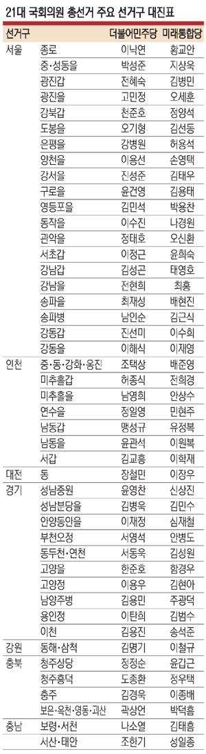 이날 현재까지 서울 지역에서 대진표가 확정된 곳은 총 20곳이다. 대표적으로는 이날 확정된 동작을(이수진 전 판사-나경원 미래통합당 의원)을 비롯해 종로(이낙연 민주당 상임선거대책위원장-황교안 통합당 대표), 광진을(고민정 전 청와대 대변인-오세훈 전 서울시장) 등이다. 구로을(윤건영 전 청와대 국정기획상황실장-김용태 통합당 의원)과 강서을(진성준 전 서울시 정무부시장-김태우 전 수사관) 등 지역에는 ‘친문(친문재인) 대 반문(반문재인)’이라는 상징성 있는 인물들이 대결한다.