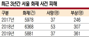 지난해 서울 시내 화재 사망자의 10명 중 6명은 주거시설에서의 화재로 숨진 것으로 나타났다. 6일 서울시 소방재난본부에 따르면, 2019년 서울 시내에서 발생한 화재 5881건 중 2422건(41.2%)이 주거시설에서 발생한 것으로 집계됐다. 주거시설 유형별로는 공동주택 1409건(24%), 단독주택 983건(16.7%), 기타 주택 30건(0.5%) 등으로 나타났다.