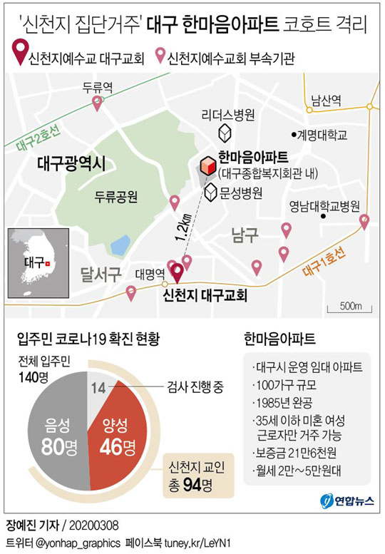 보건당국 한 관계자는 “지금까지 확인한 집단거주지는 달서구 두류동 1곳, 이곡동 2곳, 상인동 1곳, 송현동 1곳이다”며 “이 중 일부는 센터 형태인 신천지 부속건물이나 임대아파트인 것으로 보인다”고 했다.