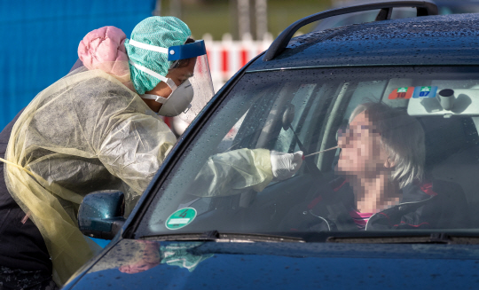 독일 의료진이 9일 뉘르팅겐에서 방호 장비를 착용하고 ‘드라이브 스루’ 방식으로 코로나19 검사를 하고 있다. EPA 연합뉴스