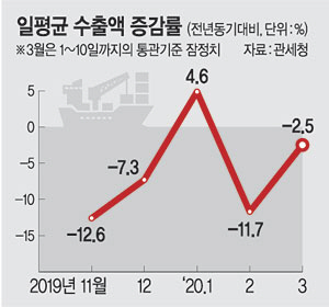 코로나19 사태 여파와 유가 변동으로 인해 월 하반기로 갈수록 수출 상황은 더 악화할 것이라는 게 정부와 민간의 공통된 인식이다. 중국(14.8%), 미국(45.4%), 중동(51.0%), 일본(22.7%) 등 주력 수출국의 수출증가액이 이달 초까지는 양호한 흐름을 보였지만 이들 국가에서 코로나19 사태가 본격 확산하고 있어 지속될지 여부를 장담하기 힘든 상황이다.