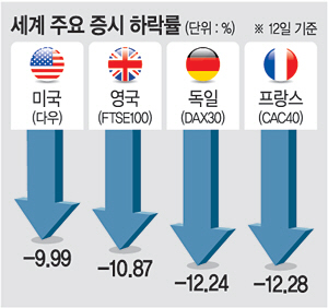 12일 뉴욕증권거래소(NYSE)에서 다우존스 30 산업평균지수는 전장보다 2352.60포인트(9.99%) 급락한 21200.62에 거래를 마치는 등 미국증시 3대 지수가 일제히 10% 가까이 추락했다. 지난 9일 7% 넘는 추락세를 기록한 충격이 채 가시기도 전에 더 충격이 큰 폭락 장세가 재현되면서 미 금융시장은 그야말로 패닉 상태에 빠졌다. 한발 앞서 마감한 유럽증시의 경우 주요국 증시가 일제히 10% 넘게 폭락하면서 미국보다 더 큰 충격을 받았다. 중남미, 아시아 등 다른 글로벌증시 역시 기록적 폭락세를 나타냈다.