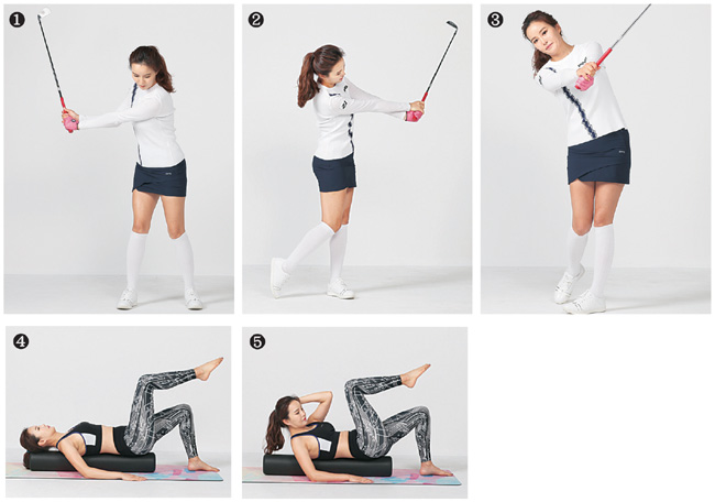 △몸통의 회전 능력을 키우는 골프 필라테스 = 골프에서 중요한 것은 견갑골(날개뼈)과 코어의 안정화를 유지하며 몸통의 회전 근육을 발달시키는 동작이다. 특히 바닥면이 좁은 폼롤러 위에서 동작을 하면 다양한 작은 근육을 더 활성화시킬 수 있다. 먼저 중심을 잡고 몸통의 회전능력을 더 키울 수 있으며 팔이 주가 아닌 몸통의 회전이 주가 되는 스윙을 구사하는 데 도움이 된다. 사진 ④처럼 폼롤러를 세로로 놓고 엉덩이부터 머리까지 모두 닿을 수 있도록 눕는다. 한쪽 다리를 ‘ㄱ ’자 모양으로 하고 잠시 중심을 잡는다. 그런 다음 사진 ⑤와 같이 들어 올린 다리와 반대 손을 머리 뒤로 가져가서 상체를 일으킨다. 이때 들어 올린 팔꿈치와 다리가 서로 닿을 수 있을 만큼 상체를 들어 몸통을 감싸고 있는 외내 복사근에 힘을 느낄 수 있도록 반복한다.