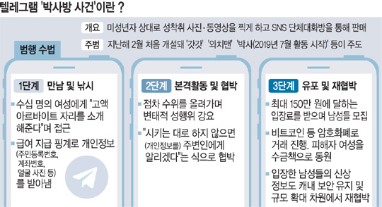 20일 경찰에 따르면, 이른바 ‘텔레그램 박사방 사건’의 핵심 인물인 A(24) 씨는 SNS, 채팅앱 등에 ‘스폰 알바 모집’ 같은 글을 게시해 피해자들을 유인한 뒤, 얼굴이 나오는 나체 사진을 받아 이를 빌미로 성착취물을 찍게 한 것으로 나타났다. A 씨는 2019년 9월쯤 텔레그램 대화방인 ‘n번방’ 활동을 시작했으며, 자신이 운영하는 ‘박사방’에서 피해자들을 ‘노예’로 지칭하면서 성착취물 유포를 시작했다. 경찰 조사 결과 A 씨는 돈을 벌기 위해 누구나 영상을 볼 수 있는 ‘맛보기’ 대화방과 일정 금액의 암호화폐를 지급하면 입장이 가능한 3단계 유료 대화방을 운영했던 것으로 나타났다. 1단계 대화방의 경우 20만∼30만 원의 입장료를 요구하고 2단계 70만 원, 3단계 150만 원 정도의 금액을 요구한 것으로 알려졌다. A 씨는 이같이 착취한 영상물 판매로 억대의 수익을 거둔 것으로 확인됐다.