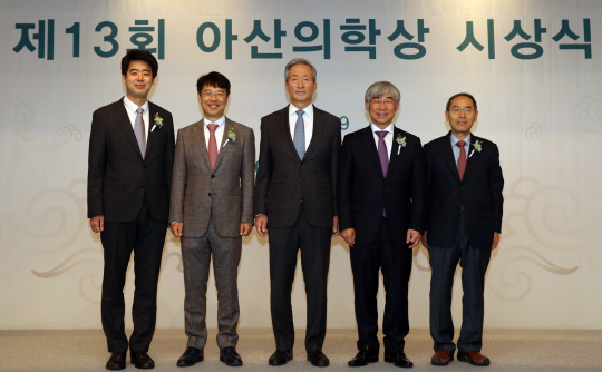 이날 시상식에서는 정몽준(사진 가운데) 아산재단 이사장이 참석한 가운데 기초의학부문 수상자 이원재(53·사진 왼쪽 두 번째) 서울대 생명과학부 교수와 임상의학부문 이재원(63·〃 네 번째) 울산대 의대 흉부외과학교실 교수에게 각각 3억 원, 젊은의학자부문 수상자인 주영석(38·〃 첫 번째) 카이스트 의과학대학원 교수와 이용호(40) 연세대 의대 내과학교실 교수에게 각각 5000만 원 등 4명에게 총 7억 원의 상금이 수여됐다.