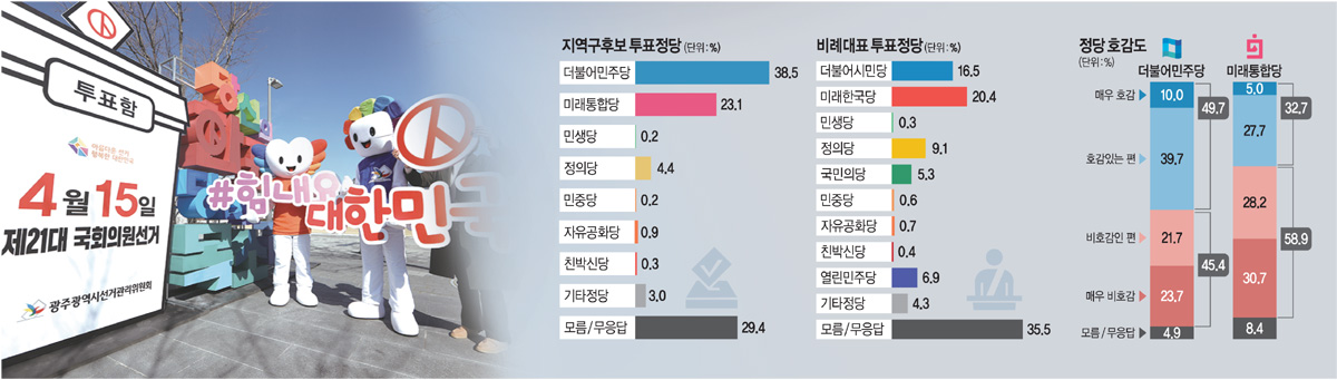 총선거 지역구 투표 시 어느 정당 후보를 찍을 것인가 하는 질문에는 더불어민주당이 38.5%, 미래통합당이 23.1%로 나왔다. 비례대표 투표 시 지지 정당에 대해서는 통합당의 위성정당(자매정당)인 미래한국당이 20.4%로 1위에 올랐으나, 범여권 비례대표 연합정당인 더불어시민당(16.5%)과 민주당의 위성정당을 자임하는 열린민주당(6.9%)의 총합에는 밀렸다.