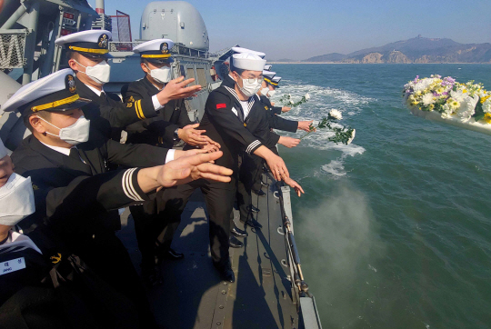 천안함 폭침 사건 10주기를 앞둔 23일 해군 2함대 황도현함 장병들이 인천 옹진군 백령도 천안함 위령탑 인근 해상에서 꽃을 뿌리며 46명의 희생자 넋을 기리는 해상위령제를 지내고 있다.