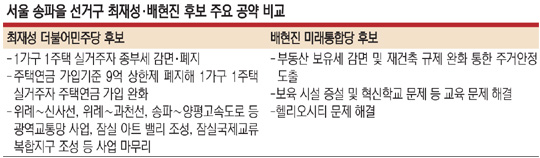배 후보는 이에 대해 “집권당 후보가 정부 정책 방향과 반대로 우리 당 공약을 본인 공약으로 냈다”고 반박했다. 배 후보는 “애꿎은 선의의 피해자가 발생한 부동산 보유세를 개편하고, 주공5단지 재건축 문제도 해결하겠다”고 했다.