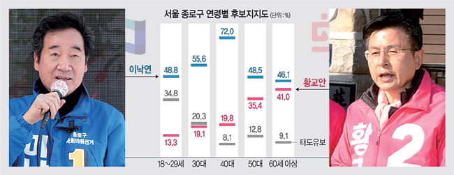 이 후보는 40대에서 72.0% 대 19.8%, 30대에서 55.6% 대 19.1%, 18~29세에서 48.8% 대 13.3%로 황 후보를 압도했다. 이 후보는 50대에서도 48.5% 대 35.4%로 우세를 보였다. 다만, 60세 이상 연령층에서는 이 후보 46.1%, 황 후보 41.0%의 지지로 두 후보가 경합하는 것으로 나타났다.