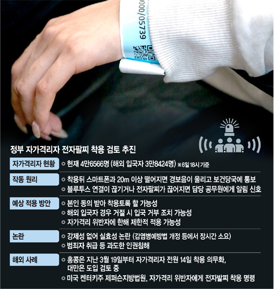 물론 정부의 전자팔찌 도입 검토는 통제되지 않는 자가격리자 문제로 인해 시작됐다. 6일 기준 국내 자가격리자는 4만6566명이고, 이 중 해외 입국자만 3만8424명이다. 자가격리 지침 위반도 하루 6건 정도 발생하고 있다. 이날 대검찰청은 ‘모든 격리조치 위반 행위자’에 대해서는 원칙적으로 구공판(정식 재판에 회부하는 기소)하고 향후 재판에서도 징역형의 실형을 구형할 예정이라고 밝혔다. 주무부처인 복지부에서는 신중한 반응을 보이고 있다. 김강립 중앙재난안전대책본부 1총괄조정관은 6일 브리핑에서 “전자팔찌가 실질적으로 효과적인 수단이 될 수도 있겠지만 실제 적용했을 때 나타날 수 있는 다른 문제점이나 법리적인 문제가 없는지 등 같이 고민돼야 하는 방안”이라고 밝혔다.