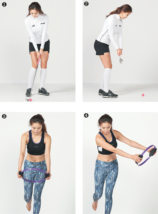 ▶어프로치를 위한 골프 필라테스=정확한 콘택트가 중요한 어프로치 시 손목을 고정하고 왼쪽 다리에 체중을 둔 채 하체를 고정해야 한다. 이렇게 온몸을 모두 고정한 상태에서 어깨 회전으로 퍼팅하듯이 밀어주는 연습을 꾸준히 한다면 어프로치 능력 향상뿐 아니라 코어와 밸런스 및 팔꿈치 손목 보완을 위한 트레이닝에도 효과를 거둘 수 있다. 먼저 사진③처럼 필라테스 서클을 잡고 어드레스 자세를 취한 다음 오른발을 든다. 다음으로 사진④와 같이 내쉬는 숨에 오른발을 들어준 상태로 양팔을 쭉 뻗어 서클을 안으로 조여내며 팔을 왼쪽으로 보낸다. 이때 밸런스 잡기가 어렵다면 오른 다리를 뒤쪽 바닥에 앞꿈치만 지지하고 버텨도 좋다. 서클 대신 볼을 이용해도 된다.