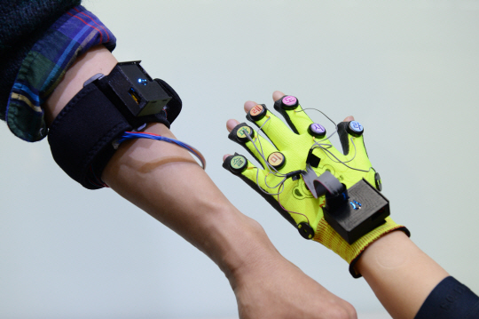 한국전자통신연구원(RTRI)은 청각장애인이 자신의 목소리에서 나오는 음의 높이인 ‘피치(Pitch)’를 분석해 소리를 인식할 수 있도록 한 ‘촉각 피치(Pitch) 시스템’을 개발했다고 20일 밝혔다. 사진은 ETRI 연구진이 개발 중인 손목 밴드·장갑 형태의 촉각 인식 기술 모형.