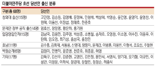 키는 초선이 쥐고 있다는 평가가 나온다. 68명에 이르는 초선 면면으론 일단 친문이 유리하다. 서울 광진을에서 당선된 고민정 전 대변인 등 청와대 출신이 15명(22.1%)으로 최다이며, 임호선 전 경찰청 차장 등 문재인 정부에서 공직을 지낸 초선도 4명(5.9%)이다. 여기에 이수진 전 판사 등 양정철 전 민주연구원장이 주도한 영입 인재와 입당 인사도 15명(22.1%)이다.