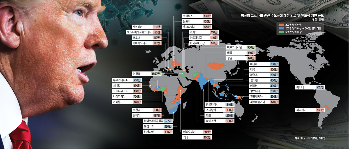 미국은 신종 코로나바이러스 감염증(코로나19) 누적 확진자·사망자 1위를 기록한 상황에서도 다른 나라 지원에 공을 들이고 있다. 21일 미국 국제개발처(USAID)와 국무부에 따르면 코로나19 대응을 위해 아프리카, 아시아, 유럽 등 세계 각국의 의료장비와 소독, 통신 장비, 식수 제공에 5억 달러(약 6192억 원) 규모의 지원을 약속했고, 현재까지 2억7400만 달러 규모의 지원을 했다. 도널드 트럼프 미국 대통령이 직접 나섰다. 트럼프 대통령은 지난 13일 백악관에서 가진 코로나19 태스크포스(TF) 브리핑에서 “다른 나라들이 인공호흡기를 구하는 데 어려움을 겪고 있다”며 “어느 나라도 우리나라처럼 할 수 없기 때문에 다른 나라들을 돕겠다”고 말했다. 14일에는 스페인과 이탈리아·영국에 대한 지원을, 17일에는 멕시코에 대한 지원을 언급했다. 트럼프 대통령이 발등에 떨어진 불을 꺼야 하는 다급한 처지에도 불구하고 타국 지원에 나선 건 코로나19를 통해 영향력을 확대하려는 중국의 움직임을 막기 위한 행보로 풀이된다. 중국의 국제기구 장악을 막으려는 행보도 본격화하고 있다.