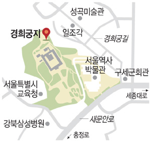 경희궁에서 궁궐의 위용을 그다지 느낄 수 없는 것은 수영장까지 있던 일제의 경성중이 들어서면서(1910년) 헐렸던 궁궐의 면적이 서울시의 무분별한 건축 허가로 인해 절반 정도로 축소됐기 때문이다. 궁궐이 있었던 곳엔 구세군빌딩과 성곡미술관, 서울역사박물관, 서울시교육청, 일조각 등의 건물이 들어서 있다. 경희궁이 비록 이궁(정치적 상황이나 화재 등에 의해 임금이 거처를 옮기는 곳)이었으나 흥선대원군이 경복궁 중건 때 경희궁의 전각을 가져다 쓰도록 했던 점 등도 궁궐의 위용에 치명적 손상을 입혔을 터이다. 원래는 구세군회관 건물 자리에서 동쪽을 바라보고 있던 흥화문도 일제가 떼어가 이토 히로부미(伊藤博文)를 위한 사당의 문(박문사의 정문)으로 쓰던 것을 이전해 복원했으니 경희궁의 운명은 참으로 기구하다.