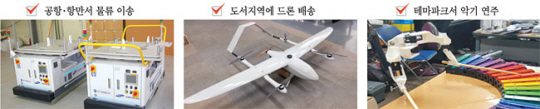 특화로봇 육성사업에 선정된 3개 컨소시엄 중 첫 번째 과제를 수행하는 ㈜지에스이는 인하대로부터 물류기술을 지원받아 ‘하이브리드 유도기반 무인이송로봇(AGV·위 왼쪽 사진)’을 개발한다. 좁은 이동 통로와 고밀도 작업환경에서도 자율운행이 가능한 지능형 물류로봇이다. 시제품이 완성되면 수요처로 컨소시엄에 참여한 ㈜이노디스의 생산설비와 자재창고 등에 투입될 예정이다. 이노디스는 반도체와 디스플레이에 들어가는 부품을 공급하는 인천의 유망 중소기업으로 로봇을 통한 공장 자동화를 추진 중이다. AGV는 이후 범위를 확대해 공항과 항만, 유통매장 등에도 보급형으로 제작돼 공급될 예정이다.