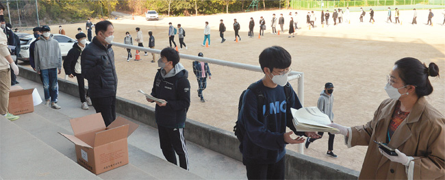 신종 코로나바이러스 감염증(코로나19) 사태로 올해 첫 전국연합학력평가가 ‘자율 재택시험’으로 치러진 24일 오전 서울 은평구 충암고에서 마스크를 착용한 고3 수험생들이 ‘워킹스루’ 방식으로 시험지를 받아가고 있다.