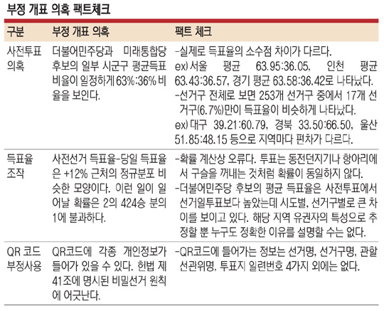 선관위 역시 같은 입장이다. 선관위는 “민주당 후보의 사전투표 득표율이 선거일 투표 득표율보다 10%포인트 높다는 것을 근거로 조작 의혹이 있지만, 시·도별(광주 1.89%포인트, 서울 13.06%포인트), 선거구별(전북 군산 0.52%포인트, 충남 당진 18.31%포인트)로 큰 차이를 보이고 있다”며 “해당 지역 유권자 특성으로 추정할 뿐, 누구도 정확한 이유를 설명할 수 없다”고 했다.