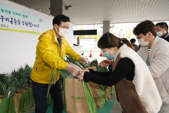 서울 성북구가 신종 코로나바이러스 감염증(코로나19)으로 어려움을 겪고 있는 자매결연도시의 농산물 완판에 다시 나섰다. 성북구는 29일 오전 10시부터 구청 앞 성북천 일대에서 전북 정읍시, 전남 담양군, 충북 괴산군의 친환경 농산물 꾸러미 판매를 시작했다고 밝혔다. 정읍시, 담양군, 괴산군 세 도시는 성북구 소재 학교에 친환경 무상급식 재료를 공급해왔으나 코로나19로 개학이 연기되며 판로가 막혀 어려움을 겪고 있다. 성북구 관계자는 “구가 서울시 최초로 친환경 무상급식을 시작한 도시로서 선정 기준이 매우 깐깐한데도 세 도시는 항상 기준을 충족하는 친환경 농산물을 공급해 지역 청소년의 건강에 많은 기여를 한 만큼 어려울 때 작은 도움이라도 줘야 한다는 판단에 이번 행사를 마련했다”고 밝혔다.
