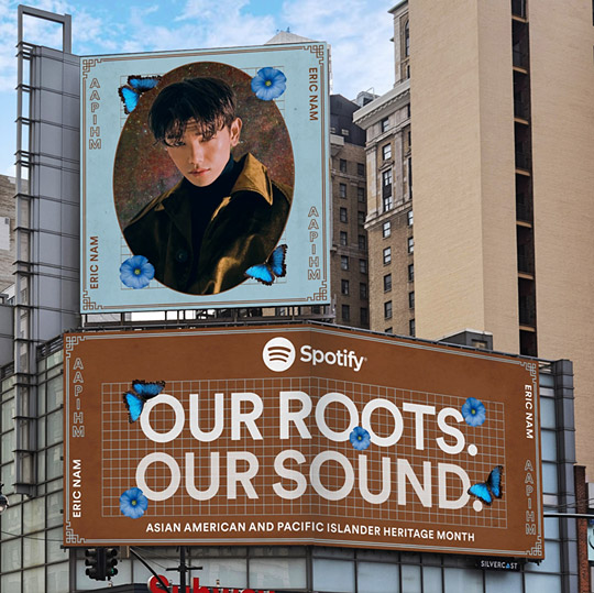 에릭남은 5월 한 달간 스포티파이가 아시안 아메리칸, 아시아태양평 아티스트를 소개하는 ‘우리의 뿌리, 우리의 사운드(Our Roots, Our Sound)’ 캠페인을 미국 뉴욕 타임스스퀘어와 팬스테이션 옥외광고에도 얼굴을 비친다. 또한, 스포티파이 플랫폼 내 플레이리스트, 팟캐스트 등을 통해 집중 조명된다.