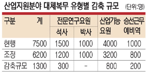이공계 대학원 졸업자가 기업부설 연구소나 정부 출연연구기관 등 연구기관에서 연구·개발(R&D) 업무에 종사하는 전문연구요원은 300명이 줄어든다. 박사과정 전문연구요원 정원은 1000명이 유지되나, 석사급 전문연구요원이 1500명에서 1200명으로 축소된다.