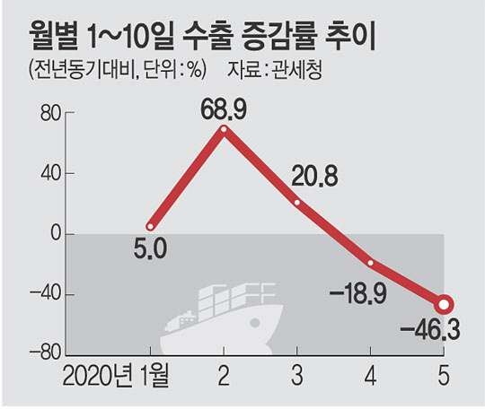 11일 관세청이 내놓은 5월 1∼10일 수출입 실적을 보면 수출액은 69억1900만 달러로 전년 동기(128억8100만 달러)와 비교해 46.3%나 줄었다. 2019년 2월 1∼10일(-57.1%) 이후 1년 3개월 만에 최대 감소 폭을 기록했다. 정부가 10일 단위로 수출입 실적을 발표하기 시작한 2016년 4월 이후 역대 두 번째로 많이 줄어든 수치다. 이 기간 조업 일수는 5일로 전년 동기 대비 1.5일 적었다. 이에 따라 조업 일수를 고려한 하루 평균 수출액은 13억8000만 달러로 1년 전 대비 30.2% 적었다.