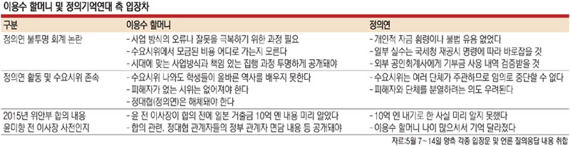 이 할머니는 지난 7일 기자회견을 비롯해 이날까지 언론을 통해 ‘일본군 성노예제 문제 해결을 위한 정의기억연대’(정의연)와 그 전신 격인 한국정신대문제대책협의회(정대협) 활동에 대해 다양한 문제점을 제기했다. 우선 이 할머니와 정의연의 입장이 가장 첨예하게 엇갈리는 대목은 후원금 회계가 불투명하다는 논란이다. 이 할머니는 7일 기자회견에서 “성금과 기금 등이 모이면 할머니들에게 써야 되는데 그런 적이 없다”고 잘라 말했다. 정의연이 시대에 맞는 사업 방식을 갖추고, 책임 있는 집행 과정을 투명하게 공개해야 한다는 입장이다. 그러나 정의연은 11일 해명 기자회견을 통해 “개인적 자금 횡령이나 불법 유용이 없었다”면서도 일부 회계 기록상 발견된 문제에 대해선 “국세청 재공시 명령에 따라 바로잡겠다”며 “외부 회계사에게 기부금 사용 내역을 검증받겠다”고 밝혔다. 또 이나영 정의연 이사장은 이날 YTN라디오에서 “기부해주신 사람들이 다치지 않는 범위에서 공개할 수 있는 것은 법적인 상담과 적절한 조언을 통해서 공개를 하려고 한다”고 설명했다.