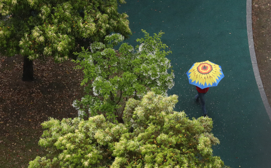스승의 날인 15일 전국 곳곳에 비가 내리는 가운데 이날 오전 광주 서구 평화공원에서 시민이 우산을 쓴 채 걸어가고 있다.
