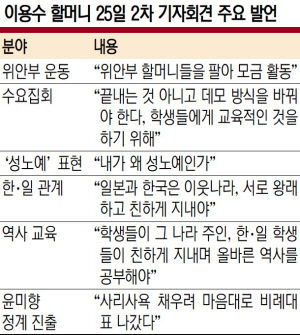 위안부 피해자 이용수(92) 할머니는 25일 정의기억연대(정의연)와 윤미향(전 정의연 이사장) 더불어민주당 비례대표 당선인에 대한 2차 기자회견에서 “한·일 양국 학생들이 친하게 지내며 올바른 역사교육을 받아야 한다”고 조언했다. 이뿐만 아니라 이 할머니는 30여 년 위안부 운동을 하며 느낀 위안부 운동 방식 변화, 한·일 관계의 모습 등 미래지향적 제안을 내놓기도 했다.