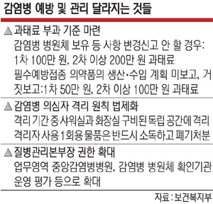 이날 국무회의에서 통과된 감염병의 예방 및 관리에 관한 법률 시행령 일부개정령안에는 과태료 부과 기준과 감염병 의심자의 격리 원칙의 법적 근거를 마련하고, 질본부장의 권한을 확대하는 등 내용이 포함됐다. 우선 감염병 병원체의 보유 등 사항이 변경됐을 때 신고를 하지 않으면 1차로 100만 원, 2차 이상부터는 200만 원의 과태료를 부과한다는 내용이 담겼다. 또 필수예방접종 의약품의 생산·수입 계획을 보고하지 않거나 거짓으로 보고하는 경우 1차 50만 원, 2차 이상부터는 100만 원의 과태료를 부과하기로 했다. 감염병 의심자의 격리에 대한 원칙도 법적으로 규정됐다. 시설 또는 자택에서 격리 시 대상자는 샤워실과 화장실이 구비된 독립 공간에서 격리돼야 한다. 질본부장은 중앙감염병병원의 운영 주체가 되는 등 권한이 늘었다. 중앙감염병병원과 감염병 병원체 확인 기관의 운영 평가 등 권한이 질본부장에게 위임됐는데, 감염병 위기 상황에서 전문적인 대응을 보다 신속·원활하게 하기 위한 법제화로 보인다.