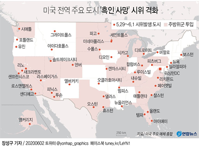 이어 이번 사태 대응을 위해 2만명 이상의 주 방위군 병력이 미전역에서 가동됐다고 국방부 당국자를 인용해 보도했다.