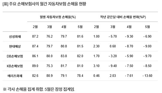 그러나 3월에는 KB손해보험(-9.4%포인트), 삼성화재(-5.7%포인트), DB손해보험(3.2%포인트)에서 손해율이 낮아졌고, 4월에는 감소세가 5개사 전체로 확대됐다.