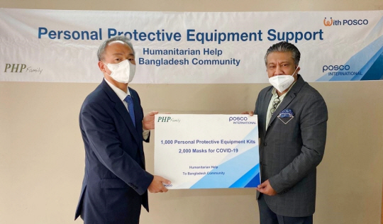 포스코인터내셔널은 지난 8일 신종 코로나바이러스 감염증(코로나19)이 빠르게 확산하고 있는 방글라데시에 방호복 키트 1000개와 마스크 2000개를 지원했다고 9일 밝혔다. 방호복과 마스크는 이종범(왼쪽) 포스코인터내셔널 방글라데시 다카지사장이 현지 최대 압연사인 PHP 스틸사의 모하메드 모신(오른쪽) 부회장을 통해 전달했다.