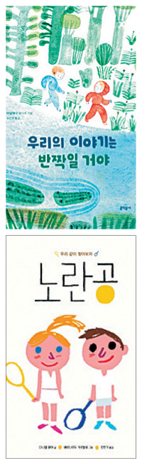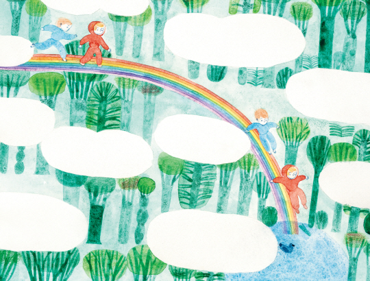 그림책 ‘우리의 이야기는 반짝일 거야’와 ‘노란공’에서는 주인공이 두 사람이다. ‘우리’가 주인공이라는 것은 고전적인 단독 영웅 서사가 지닌 패권주의와 인종주의를 허물겠다는 시도다. 두 작품 모두 성별 고정관념을 뛰어넘는 이야기이며 인종 다양성을 고려한 주인공이 나온다. ‘우리의 이야기는 반짝일 거야’의 주인공 주앙과 팀은 둘 다 다갈색 머리카락을 가졌지만 피부색은 비워두었기 때문에 특정 인종으로 지칭되지 않는다. 빨간 모자가 달린 옷을 입은 팀은 겁이 없고 파란 옷을 입은 주앙은 조심성이 많다. 팀은 큰 배를 몰아보고 싶어 하고 주앙은 종이배 만들기를 좋아한다. 주앙에게 필요한 것이 자신감이라면 팀에게 필요한 것은 신중함이다. 둘은 힘을 합쳐 대모험을 성공적으로 수행한 다음 무지개로 만든 미끄럼틀을 타고 집으로 돌아온다(그림). 밀림과 바닷속을 가로지르는 서정적이면서도 강렬한 모험이다. 둘 중 한 사람은 독자이며 한 사람은 책 속의 주인공인데 단서는 마지막 장면에 있다.