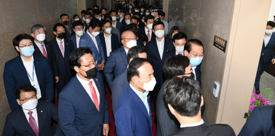미래통합당 의원들이 16일 오전 자신들을 상임위원회에 강제 배정한 헌정 사상 초유의 사태에 항의하기 위해 박병석 국회의장실로 들어가고 있다.