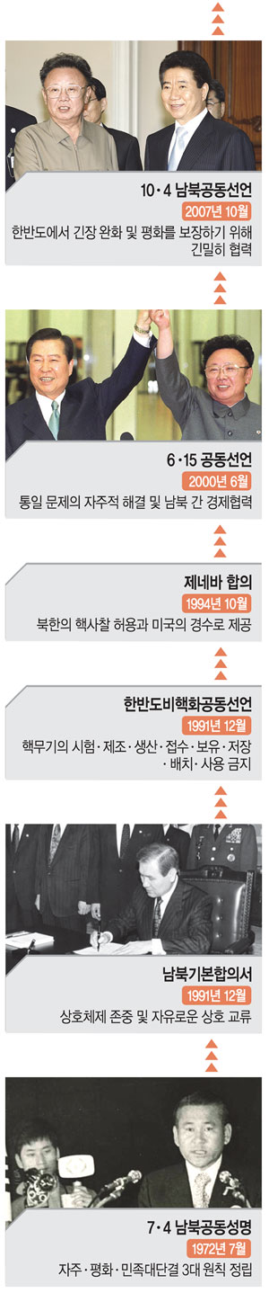 한반도비핵화공동선언은 남북이 제5차 고위급회담에서의 합의로 이뤄진 대표접촉에 따라 1991년 12월 31일 채택됐고, 1992년 2월 19일 제6차 고위급회담에서 발효된다. 내용은 크게 △핵무기의 시험·제조·생산·접수·보유·저장·배치·사용 금지 △핵에너지의 평화적 이용 △핵 재처리시설 및 우라늄 농축시설 보유 금지 △비핵화를 검증하기 위해 상대측이 선정하고 쌍방이 합의하는 대상에 대해 남북핵통제공동위원회가 규정하는 절차와 방법으로 사찰 등이었다. 하지만 당시 북한은 이미 핵 재처리 작업을 벌이며 수십 ㎏의 플루토늄을 보유한 상태였고, 북측의 거짓말은 1992년 7월 국제원자력기구(IAEA)가 신고 플루토늄 양과 실제 양이 일치하지 않는 것을 확인하며 발각된다. 반면 한국은 해당 선언을 이유로 주한미군이 보유하고 있던 핵무기마저 철수시켰다. 한국은 북한 지역에 대한 사찰을 주장했지만, 북측은 사찰의 범위가 ‘쌍방이 합의하는 대상’이란 문구를 이용해 사찰에 응할 수 없다고 버텼다.