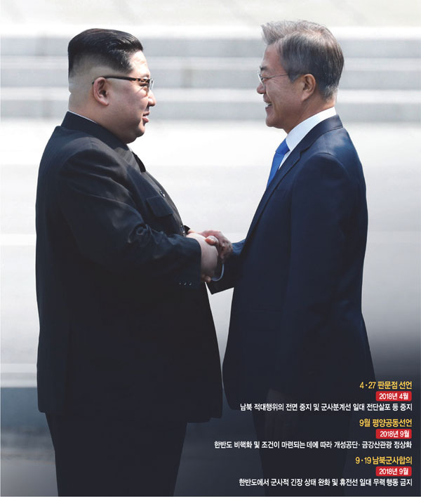 같은 해 5월 26일 문 대통령과 김 위원장은 판문점 북측 지역 통일각에서 비공개로 실무형 정상회담을 가졌다. 하루 뒤인 27일 발표된 내용에 따르면, 남북 정상은 당시 회담에서 4·27 판문점 선언의 조속한 이행 등을 재확인했다. 약 4개월 뒤인 9월 18일부터 20일까지 2박 3일간 평양에서 문 대통령과 김 위원장의 3차 남북정상회담이 열렸다. 회담 둘째 날인 19일 남북 정상은 평양 공동선언 합의문에 서명한 뒤 그 내용을 발표했다. 군사적 긴장 완화 내용을 담은 9·19 남북군사합의서에는 지상과 해상, 공중 등 모든 공간에서의 적대행위 중지, 어떤 경우에도 무력을 사용하지 않을 것, 어떤 수단·방법으로도 상대 관할구역을 침입·공격하지 않을 것 등의 내용이 포함됐다.