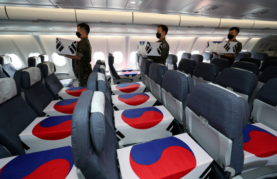 22일(현지시간) 미국 하와이 히캄 공군기지에서 공군 장병들이 미국 측으로부터 인수한 6·25전쟁 국군 전사자 유해를 우리 공군기인 시그너스(KC-330)의 화물칸이 아닌 승객 좌석에 안치하고 있다.