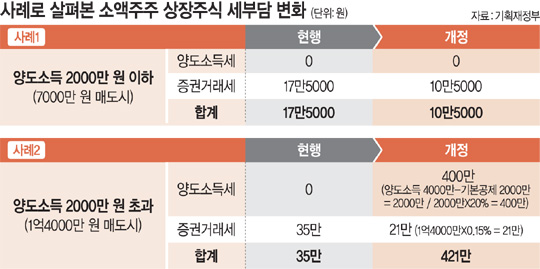 개정안에 따르면, 증권거래세는 7000만 원에 0.15%를 곱한 10만5000원으로 줄어든다. 양도소득의 과세 표준(과표·세금을 매기는 기준)은 2000만 원까지는 기본공제를 받기 때문에 0원이 돼 양도소득세는 낼 필요가 없다. 따라서 개정안에 따른 세 부담 총액은 10만5000원이 된다.