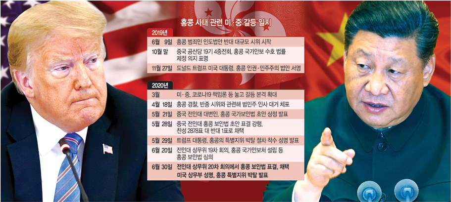 미국 정부가 29일(현지시간) 홍콩의 특별지위를 전격 박탈하고, 방산물자 및 ‘이중용도’ 기술의 홍콩 수출을 전면 중단했다. 하지만 중국은 30일 예상대로 홍콩 국가보안법(홍콩 보안법)을 강행 처리했다. 홍콩 문제를 놓고 ‘강 대 강’ 대치를 이어온 미·중은 최근 연일 무력시위에도 나서면서 양국 간 갈등이 더욱 격화할 것으로 전망된다.