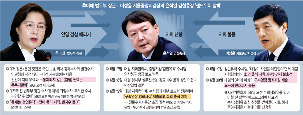 추미애 법무부 장관은 독립성이 보장된 검찰을 향해 위법성 논란을 불러올 수 있는 일반사건 영역까지 사실상 지휘에 나서고, 이성윤 서울중앙지검장이 이끄는 서울중앙지검에서는 대검찰청의 지휘에 불응하는 모습을 보여 법무부-대검찰청-서울중앙지검의 혼선이 극에 달하고 있다. ‘살아 있는 권력 수사’ 과정에서 여권의 노골적인 사퇴압박을 받고 있는 윤석열 검찰총장의 고민도 깊어지는 모습이다.