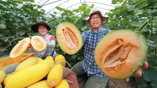 경남 함양군 안의면 차오름 농장 농민들이 8일 ‘하미과’를 처음 수확해 선보이고 있다. 하미과는 중국 신장(新疆) 하미지구가 원산지인 멜론의 한 품종으로, 수분 함량이 높고 단맛이 강해 중국 황실에 진상됐던 여름철 과일로 알려져 있다.