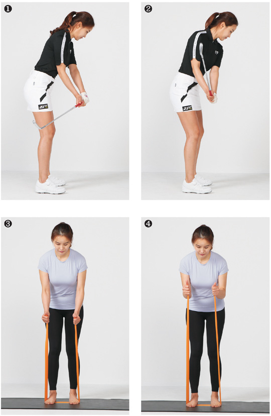 먼저 사진 ③처럼 어드레스 자세에서 발바닥을 모으고 서 밴드를 발밑에 고정한다. 양손으로 밴드를 잡고 사진 ④처럼 양팔을 ‘ㄴ’ 형태로 만든다. 이때 팔꿈치를 몸통에 밀착해 상완근이 움직이지 않도록 고정한다.